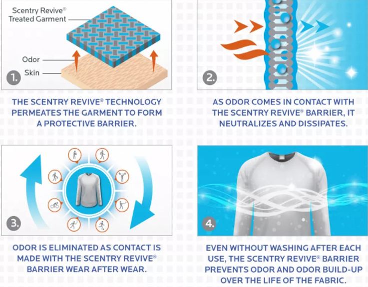 Scentry Revive'in kokuları nötralize ettiği ve art arda beş defaya kadar giyimde tazeliği koruduğu kanıtlanmıştır.